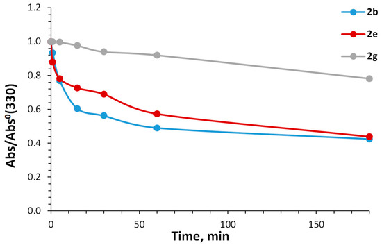 Kinetic curves of hydrolysis of titanocene derivatives 2b, 2e, 2g, obtained from the value of optical absorption at a wavelength of 330 nm.