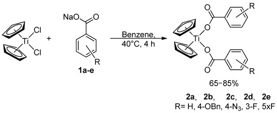 The synthesis of titanocene dicarboxylates 2 was carried out according to Scheme 2. The best yields of target compounds were obtained using absolute benzene as a solvent [20], while our attempts to use methanol, aqueous methanol, chloroform, and acetone did not lead to yields of target compounds greater than 10–15%.