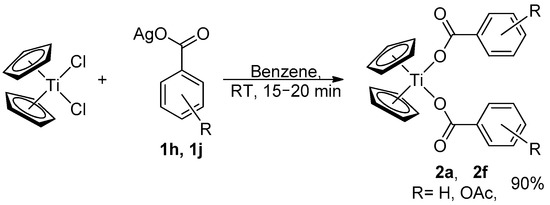 Synthesis of titanocene dicarboxylates 2a, 2f using silver carboxylates.
