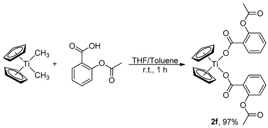 We also tested a third alternative method for titanocene dicarboxylate synthesis, considering that the aspirin salts may undergo partial deacetylation in solution, which leads to the formation of mixtures of structurally similar coordination compounds with one or two acyl groups. In this method, to obtain a pure compound, 2f, we used the aspirin on its own and not in the form of a carboxylate salt. Using dimethyltitanocene, which is capable of reacting with the carboxyl group of aspirin, as a starting Ti (IV) derivative, it was possible to obtain the target compound 2f in a high yield and not contaminated by side products (Scheme 4). This method allows the reaction to be carried out in a moderately acidic medium and does not require the use of basic carboxylic acid salts, which, most likely, are the cause of the formation of by-products.