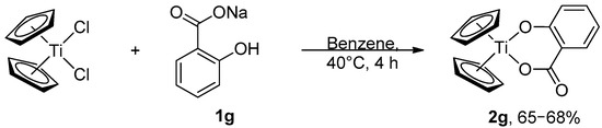 Synthesis of bis(η5-cyclopentadienyl)salicylatotitanium(IV) 2g: Method A: 2g was obtained as a dark purple crystalline precipitate from sodium salycilate 1g (32 mg, 0.2 mmol) and titanocene dichloride (50 mg, 0.2 mmol). Yield 40 mg, 60%. Method B: A solution of titanocene dichloride (498 mg, 2 mmol) and salicylic acid (303 mg, 2.2 mmol) in 30 mL of chloroform was added dropwise to 10 mL of water with stirring and was stirred at 30 °C for 2 h. The organic layer was separated, washed with cold water and brine, and then dried over anhydrous sodium sulfate. The resulting dark purple solution was evaporated on a rotary evaporator, and the dark residue was reprecipitated from the methylene chloride:petroleum ether 1:2 system and washed with a small amount of diethyl ether on the filter [29]. Yield 450 mg, 68%. 1H NMR (CDCl3, 400 MHz, δ ppm):8.19 (dd, J = 7.87, 1.56 Hz, 1H), 7.40 (m, 1H, -CHα-Ar), 6.90 (m, 1H, -CHβ-Ar), 6.57–6.68 (m, 1H, -CHγ-Ar), 6.42 (s, 10H, 2xCp). 13C NMR (CDCl3, 101 MHz, δ ppm): 170.4, 167.4, 133.4, 132.3, 120.5, 119.4, 118.7. Elemental analysis: calculated (%) for C17H14O3Ti C, 64.99; H, 4.49; found C 64.91, H 4.37, N 0.07, S < 0.03.
