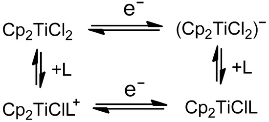 The analysis of the shape of the CV curves shows the absence of reversibility during re-oxidation after reduction (Figure 3), which allows for the conclusion that in the course of redox reactions in polar solvent (DMF), carboxylate-substituted derivatives of titanocene, as well as titanocene dichloride itself (Scheme 6) [35], undergo stepwise reduction with the loss of one of the two ligands dissociating from the Ti ion. In the course of the oxidation of the obtained particle, the vacant position appears to be occupied by the solvent molecule (DMF) and not by the initial ligand.