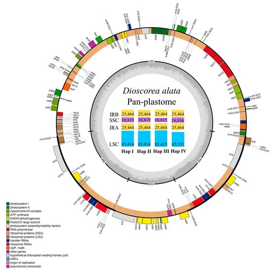 The pan-plastome map of Dioscorea alata. The genes shown on the outside of the circle are transcribed clockwise, while the genes inside are transcribed counter-clockwise. The genes belonging to different functional groups are coded by different colors. The GC/AT content is displayed by darker/lighter grey bars inside the tetrads (LSC, IRA, SSC, IRB). The lengths of LSC, IRA, SSC, and IRB regions (bp) of the four whole-plastome haplotypes (Haps I–IV) identified in D. alata were plotted in the inner circle.