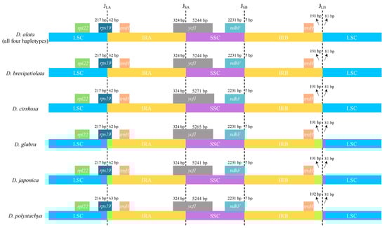 Lineage-specific expansions and contractions of IR/SC boundaries, which are common in angiosperms, often bring about the gain or loss of a small number of genes and length variations of the plastomes [32,33,34]. In this study, the locations of the IR/SC boundaries were totally identical, not only across the four whole-plastome haplotypes of D. alata, but also between D. alata and its four closely related species, i.e., D. brevipetiolata, D. cirrhosa, D. glabra, and D. japonica (Figure 3). Given that the difference in the IRA/SSC boundary between D. polystachya and the other plastomes is very trivial (Figure 3), these results provided a further proof of the conserved nature of the Enantiophyllum plastomes. In addition, in contrast to most monocots, with their IRs expanding and encompassing the rps19-trnH gene cluster (e.g., Arecales, Dasypogonaceae, Poales, Zingiberales, Asparagales, and Commelinales) [28,32], all the LSC/IRA boundaries of the Enantiophyllum plastomes were located within the rps19 gene (Figure 3).