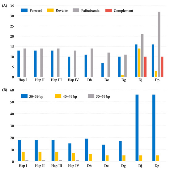 Analysis of dispersed repeats in the nine Enantiophyllum plastomes [i.e., four whole-plastome haplotypes of Dioscorea alata, and one plastome each for D. brevipetiolata (Db), D. cirrhosa (Dc), D. glabra (Dg), D. japonica (Dj), and D. polystachya (Dp), respectively]. (A) Numbers of four different repeat types; (B) frequency of dispersed repeats by length.