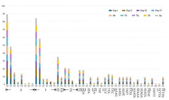 The motif types and lengths of SSRs in four whole-plastome haplotypes (Haps I–IV) of Dioscorea alata and another five Enantiophyllum plastomes. Abbreviations: Db, D. brevipetiolata; Dc, D. cirrhosa; Dg, D. glabra; Dj, D. japonica; Dp, D. polystachya.
