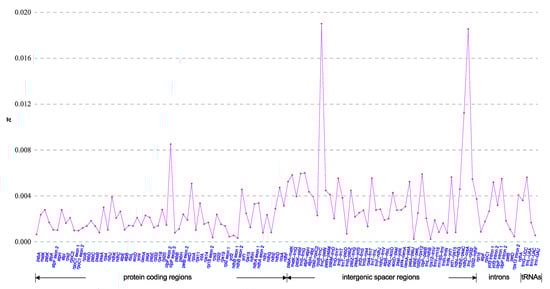 To explore the highly divergent regions for DNA barcoding and population-based studies of D. alata as well as other Enantiophyllum species, four whole-plastome haplotype sequences (Haps I–IV) of D. alata, and one plastome sequence each for another five Enantiophyllum species (i.e., D. brevipetiolata, D. cirrhosa, D. glabra, D. japonica, and D. polystachya) were aligned with the MAFFT v.7 plugin [47] in Geneious Prime 2022.0.1 with the default settings. The protein-coding sequences (CDS), intergenic spacer regions (IGS), and introns and tRNAs with an aligned length over 200 bp and at least one mutation were subjected to nucleotide diversity (π) analysis using DnaSP v.6.12.03 [48].