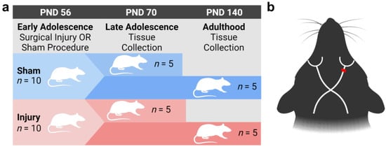 Female piebald-virol-glaxo (PVG) rats (n = 20; 140–166 g; Animal Resource Centre, Murdoch, WA, Australia) arrived at postnatal day (PND) 49 and acclimated for 7 days prior to commencing experimental procedures. Animals were housed 2–3 to a cage in standard housing within a temperature-controlled environment (21 °C) on an automatic light–dark cycle (12 h:12 h) with food and water available ad libitum. In a 2 × 2 factorial research design, rats were randomly allocated to undergo either partial transection injury or sham surgical procedures on approximately PND 56 (early adolescence) [], and for tissue collection either 2 weeks (approximately PND 70, late adolescence) or 3 months (approximately PND 140, adulthood) later. Except for routine postoperative monitoring and husbandry, rats were undisturbed until humane euthanasia. Groups (n = 5) were designated as sham-adolescent, injury-adolescent, sham-adult, or injury-adult (Figure 1a). Note that n of 3–8 is standard in electron microscopy studies where high granularity assessments of multiple measures are conducted [,,,,,,,,,,].