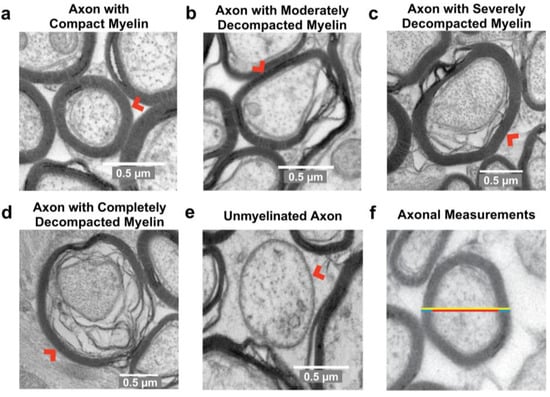 Representative images of axon cross-sections classified based on myelin compaction. Axons with compact myelin were characterized by thick, high electron density (dark appearance) myelin with <10% axon circumference affected by decompaction (a). Axons with moderately decompacted myelin had 10–35% of the axon circumference affected by decompaction (b). Axons with severely decompacted myelin had 35–99% of the axon circumference affected by decompaction (c). Axons with completely decompacted myelin were characterized by decompacted myelin surrounding the entire axon circumference (d). Unmyelinated axons had a round or oval appearance with no surrounding myelin (e). Depiction of axonal morphology measurements. Axon diameter was measured at the minimum distance (red); myelin thickness was measured at the same location, parallel to the diameter measurement and presented as an average of the 2 sides (blue); fiber diameter was measured at the same location, parallel to axon diameter and included myelin, axon, and axolemmal space if present (yellow) (f). Red arrows indicate representative axon. Scale bars = 0.5 µm.