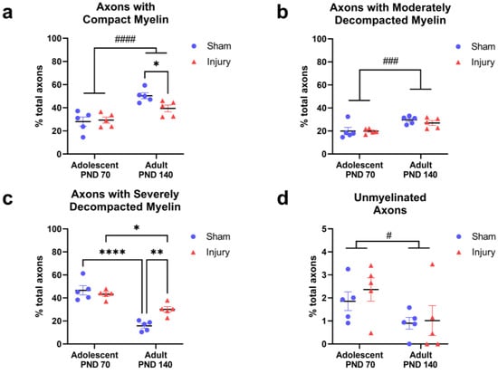 Percentage of axons classified based on myelin appearance in sham and injured rats at adolescence (PND 70) and adulthood (PND 140). Data were averaged per animal and presented as group (n = 5) means ± SEM for the following axon classifications: axons with compact, electron-dense myelin (a); axons with moderate myelin decompaction (b); axons with severely decompacted myelin (c); unmyelinated axons (d). Statistical comparisons were made between groups. #### indicate main effect p < 0.0001; ### p < 0.001; # p < 0.05. **** indicate post hoc comparison p < 0.0001; ** p < 0.01; * p < 0.05. Additional significant effects were omitted from panel (c) for space and clarity, including a main effect of age (p < 0.0001).