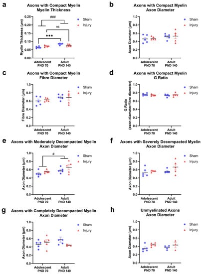Morphology measurements of axons with compact myelin and diameter measurements of axons with decompacted myelin in sham and injured rats at adolescence (PND 70) and adulthood (PND 140). In axons with compact myelin, the following morphological features were quantified by length (µm) then averaged at the level of animal and compared across groups (n = 5): myelin thickness (a); axon diameter (b); fiber diameter (c); G ratio (d). In axons with myelin decompaction or no myelin, axon diameter was quantified by length (µm) then averaged at the level of the animal and compared across groups (n = 5, but n = 4 and n = 3 in panel h for PND 140 groups) and displayed for the following axon classifications: axons with moderately decompacted myelin (e); axons with severely decompacted myelin (f); axons with completely decompacted myelin (g); unmyelinated axons (h). Data were presented as means ± SEM. Statistical comparisons were made between groups. ### indicate main effect p < 0.001; # p < 0.05. *** indicate post hoc comparison p < 0.001. ns indicate not significant.