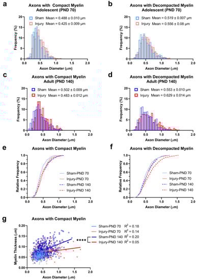 Population analyses of axon diameter and myelin thickness distributions. Overlaid histogram plots display the frequency distributions of all axons with compact myelin in injury- and sham-adolescent (PND 70) rats (a), and similarly for axons with decompacted myelin (representing all axons with 10–100% circumference affected by decompaction) in adolescent (PND 70) rats (b). Overlaid histogram plots displayed the frequency distributions of all axons with compact myelin in injury- and sham-adult (PND 140) rats (c), and similarly for all axons with decompacted myelin in adult (PND 140) rats (d). Cumulative frequency plots illustrate the distribution of axon diameters in all axons with compact myelin (e) and all axons with decompacted myelin (f) at the population level. A scatter plot including all data illustrated the relationship between myelin thickness and axon diameter in axons with compact myelin with overlaid lines of best fit (g). **** indicate slope comparison p < 0.0001.