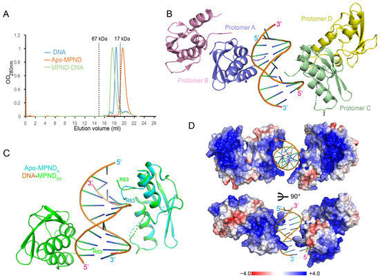 Structure of the MPND–DNA complex. (A) Size exclusion chromatography (SEC) of apo–MPND, DNA, and the complex on a SuperdexTM 200 Increase 10/300 GL column. Elution volumes of the protein standards are marked at the top of the figure. (B) The ribbon representation of the MPND–DNA complex structure. (C) The superposition of the apo–MPND (cyan) and the MPND–DNA complex (MPND, in green) structures. (D) The electrostatic surface potential of the MPND–DNA complex at ±4 kT/e: red (acidic), white (neutral), and blue (basic).