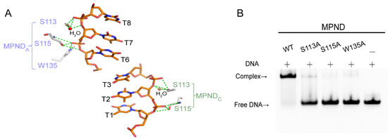 Our complex structure provided details of this interaction at the atomic level. Among the four MPND molecules solved in the asymmetric unit, only two MPND molecules were involved in direct contact with dsDNA. This binding was weak, with the total buried interface area being only 291 Å2 and 256 Å2, respectively. As shown in Figure 4A, the primary protein–DNA interactions between MPND and dsDNA were the hydrogen bonds formed between Ser113, Ser115, Trp135, and the DNA backbone. In addition, two water-mediated hydrogen bonds involving S113 were present there. However, no specific protein–base interaction was found. As such, we generated MPND point mutants to confirm the role of the above residues. In parallel, the EMSA experiments were used to determine the mutants’ qualitative differences with respect to DNA binding. All the mutants, namely S113A, S115A, and W135A, almost lost their DNA binding affinity when compared with the WT (Figure 4B).