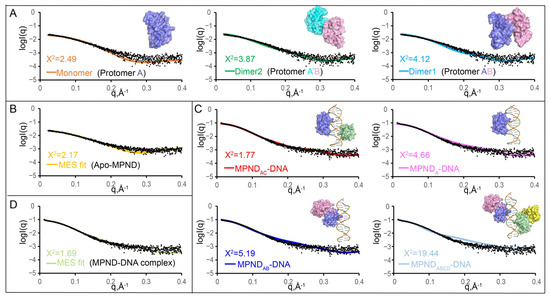 Analysis of the apo–MPND and MPND–DNA in solution via the SAXS (small-angle X-ray scattering) experiment. (A) Comparison of the SAXS experimental data (black dots) and the calculated scattering profiles for apo–MPND at 1.25 mg/mL. (B) Comparison of the SAXS experimental data (black dots) and the theoretical scattering curves of apo–MPND from the MES fit. (C) Comparison of the SAXS experimental data (black dots) and the calculated scattering profiles for the MPND–DNA complex at 1.25 mg/mL. (D) Comparison of the SAXS experimental data (black dots) and the theoretical scattering curves of the MPND–DNA complex from the MES fit.