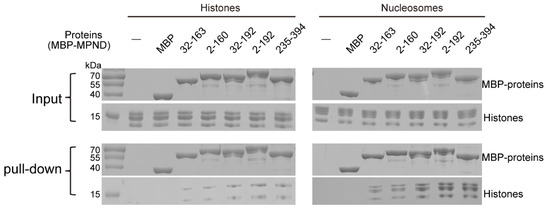 The MPND constructs fused with the MBP-tag were purified using the appropriate affinity columns. The concentrations of MBP-MPND, histones, and nucleosomes used in the experiment were 0.5 μM, 2.1 μM, and 1.5 μM, respectively. We incubated MBP–MPND with histones or nucleosomes for 3 h at 4 °C in buffer containing 20 mM HEPES (pH 7.2), 0.15 M NaCl, and 1 mM DTT in the presence of amylose resin agarose beads. The resin was extensively rinsed with the same buffer to remove unbound or nonspecifically bound proteins. Proteins left on the beads were separated by SDS-PAGE, followed by Coomassie Bright Blue staining.