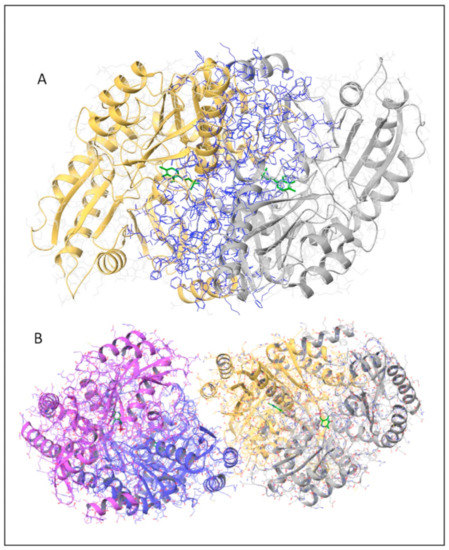 Dimeric and tetrameric hOAT structures. Cartoon representation of human hOAT structure; the protein chains are differently colored and the PLP molecules are represented as green sticks. (A) OAT dimeric structure in which all the interface residues are highlighted in blue. (B) OAT tetrameric structure in which the two dimers are colored magenta/blue and yellow/gray, respectively. The image was generated by Maestro v13.3 software (Schrödinger, New York, NY, USA).