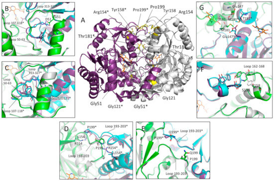 In silico analysis of the position and possible local effects of the mutations. The dimeric structure of hOAT is represented in cartoon style and the PLP-Lys292 complex is represented as orange sticks. Monomers are differently colored as grey/purple and green/cyan for the wild-type and mutated hOAT structures, respectively. Panel (A), representation of the structural position of the residues subjected to mutation on the hOAT wild-type structure, the mutation sites are indicated and highlighted as yellow sticks. Panels (B–G), over imposition of the OAT wild-type structure and the mutated structures of (B) G51D, (C) G121D, (D) R154L, (E) P199Q, (F) Y158S and (G) T181M, obtained by in silico mutagenesis. * Residues belonging to the neighboring subunit. Image was obtained by PyMol software (Schrödinger, New York, NY, USA).