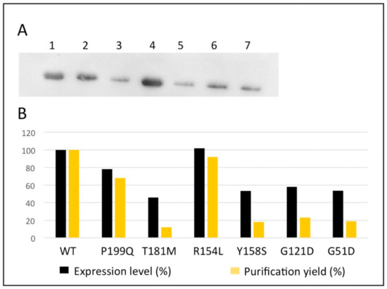 Expression level and yield of purification of the OAT variants. (A) Western Blot analysis of the soluble fraction of the E. coli cells lysate expressing (1) hOAT wild-type, (2) P199Q, (3) T181M, (4) R154L, (5) Y158S, (6) G121D and (7) G51D. (B) percentage of expression level and yield of purification of the hOAT variants with respect to those of wild-type hOAT. Expression levels were quantified by the ImageJ software on the basis of the mean intensity of the bands of two independent experiments. The percentages of yield of purification of the variants were calculated on the basis of the reported wild-type value of 35 mg/L of culture.