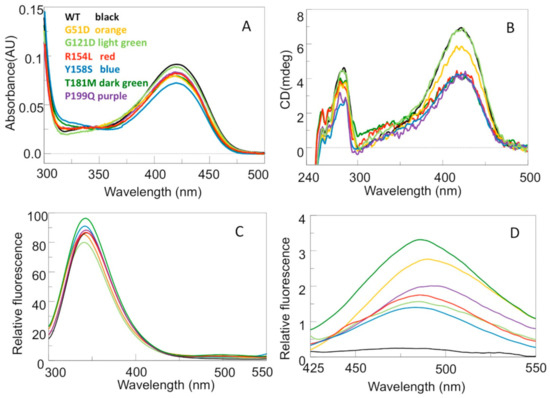 hOAT displays an absorbance band centered at 420 nm and a shoulder at 340 nm associated with positive dichroic signals at the same wavelengths. Excitation at 420 or 340 nm gives rise to an emission fluorescence spectrum with a maximum around 505–510 nm. On these bases, the 420 and 340 nm bands have been attributed to the ketoenaminic and enoliminic tautomeric forms of the internal aldimine, respectively [5]. In addition, the enzyme displays a positive dichroic band at 284 nm, and, upon excitation at 280 nm, an emission fluorescence maximum at 341 nm [5]. The far-UV CD spectra of the pathogenic variants compared with that of the wild-type hOAT indicate that the examined mutations do not affect the overall secondary structure of the enzyme (Figure S2). To understand if the mutations alter the PLP binding mode, the UV–visible absorbance and CD spectrum of each enzymatic species at 6 μM concentration were registered. Although all the variants exhibit absorbance spectra qualitatively similar to that of the wild-type, the intensity of their 420 nm absorbance bands is, even if to a different extent, lower than that of the wild-type (Figure 4A). On the other hand, as compared to the wild-type, the magnitude of the positive dichroic signal at 420 nm of the G121D variant is unaltered, while that of the remaining variants is reduced, in particular that of the R154L, Y158S, T181M, and P199Q variants (Figure 4B). The optical activity (mdeg/A420nm absorbance unit) was also measured to determine if these variants exhibit similar properties with respect to the asymmetric environment of the bound PLP in the wild-type. The wild-type, G51D, R154L, T181M, P199Q, G121D, and Y158S enzymes have optical activity values of 76.6, 74.3, 48.2, 47.4, 49.0, 77.6, and 60.3 mdeg/A420 nm, respectively. Altogether, these data suggest that the chiral environment of the internal aldimine is slightly changed in G51D, unaltered in G121D, while it is strongly changed in the remaining variants.