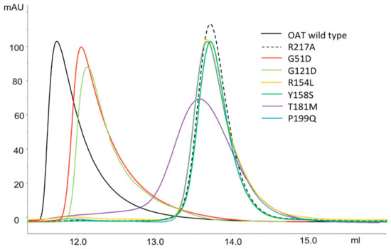 As previously mentioned, hOAT is present in solution as both homodimer and homotetramer in rapid equilibrium. Such equilibrium is influenced by cofactor binding; indeed, the OAT holoform exhibits a KDtet-dim value 5-times lower than that of apoOAT [5]. Here, the oligomeric state of the G51D, G121D, R154L, Y158S, T181M and P199Q variants was investigated by analytical SEC up to 10 µM enzyme concentration, in the presence of 20 µM exogenous PLP. As shown in Figure 5, 10 µM wild-type hOAT exhibited an elution volume of 11.7 mL, a value corresponding to the tetrameric form on the basis of the column calibration curve (Section 3). On the other hand, R154L, Y158S, T181M and P199Q at 10 µM enzyme concentration exhibited an elution volume around 13.6 mL, the same value of the OAT artificial dimer R217A [5] and corresponding to the molecular weight of a dimer (Figure 5).