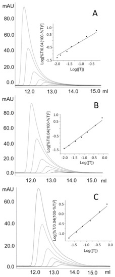 Analysis of the tetramer-dimer equilibrium of hOAT wild type, G51D and G121D variants by SEC. Chromatographic profiles obtained using a Superdex 200 10/30 Increase column equilibrated in HEPES 50 mM pH 8.0, NaCl 150 mM, PLP µM of (A) OAT wild-type, (B) G51D variant and (C) G121D variant from 10 to 0.1 µM protein concentration. Inset panels show the plots of log[%T/0.04(100 − %T)2] vs. log([T]), when [%T/0.04(100 − %T)2] = 1, [T] = KDtet-dim. Chromatograms were analyzed by Unicorn v7.3 software (GE Healthcare, Chicago, IL, USA); The linear plots were obtained using Origin9 software (OriginLab, Northampton, MA, USA).
