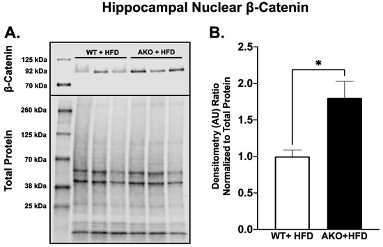 We performed Western blotting for nuclear β-Catenin in HFD-fed AKO and WT mouse hippocampal tissue. Results showed that HFD-fed AKO mice had increased expression of nuclear β-Catenin compared to WT (Figure 2; p = 0.03).