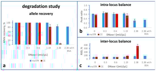 Accordingly, in terms of both intra- and inter-locus balance the maSTR assay performed superior compared to CE typing (Figure 2b,c). The generally low peak ratios obtained with both methods (Figure 2b) resulted from several loci that are disbalanced in HeLa DNA, probably due to the aneuploidy and other karyotypic characteristics of this cancer cell line []. The RSDs remained similar up to DNase concentrations of 1.19 mU µL−1 DNase. The apparent increase of the RSD in CE typing for DNA treated with 2.38 mU µL−1 DNase is a mathematical consequence of the many ADOs observed at this DNase concentration.