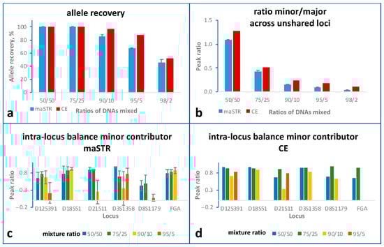 With decreasing amounts of DNA B5 in the mixture, the intensities of the alleles of DNA B5 became much lower, which was reflected by the continuous decrease of the peak ratios (Figure 3b). The low signals or low read numbers of alleles of contributor B5 for the 98:2 mixture can be seen in Supplementary Figure S17. Some alleles of contributor B5, which were at an n-1 position of an allele of DNA A5, were not called by CE and maSTR assays since they fell below the stutter thresholds. The profile of B5 contained six heterozygous loci that did not share alleles with A5 and thus could be evaluated in terms of intra-locus balances. As shown in Figure 3c,d, the intra-locus balances of these loci decreased with decreasing proportion of B5 in the mixture for maSTR assay and CE. Peak ratios could not be calculated in cases of allele drop-outs. In 90:10 mixtures, this was the case for one locus in both types of analysis. In 95:5 mixtures, allele drop-outs occurred at three loci in maSTR analysis and at four loci in CE analysis, and at a mixture ratio of 98:2, all loci displayed allele drop-outs in both types of analysis.