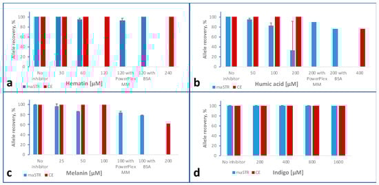 Inhibitor study comparing allele recoveries obtained with the maSTR assay (blue bars) or with CE using PowerPlex ESX17 kit (red bars). Human DNA was mixed with inhibitors of the concentrations indicated. For two samples, the PCR buffer of the maSTR assay was replaced by the reaction buffer of the PowerPlex ESX17 kit (PowerPlex MM) or supplemented with 0.6 µM BSA, respectively. Error bars represent standard deviations. (a) Results with hematin. Please note that with maSTR assay at 120 µM hematin, no alleles were called. (b) Results with humic acid. (c) Results with melanin. Please note that with maSTR assay at 100 µM melanin, no alleles were called. (d) Results with indigo.