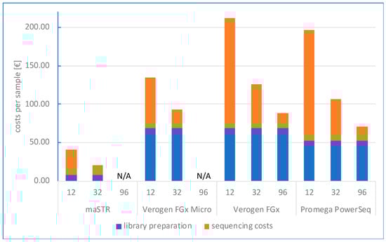 Sequencing costs, expressed as costs in EUR per sample, for the maSTR assay and three commercial, Illumina-based forensic NGS assays (Verogen’s MiSeq FGx Reagent Micro Kit and MiSeq FGx Reagent Kit, and Promega’s PowerSeq 46GY System) calculated for throughputs of 12, 32 or 96 samples, based on list prices. Please note that for maSTR and Verogen MiSeq FGx Reagent Micro Kit 96 samples are not applicable (N/A). Stacked bars represent total costs per sample, with blue and orange bars representing the proportional contribution of costs for sequencing library preparation and for sequencing reagents including flow cells, respectively.