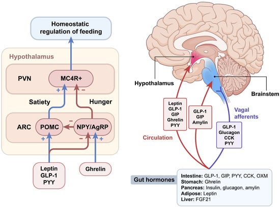 Obesity is one of the greatest health challenges worldwide and a global epidemic that causes many complications and chronic diseases. The significant morbidity and mortality rates associated with obesity have prompted a large amount of research to develop safe and effective anti-obesity medications. The bi-directional gut–brain axis, which controls hunger and satiety, is mediated by rapid-acting neuronal pathways and slow-acting hormonal mechanisms [142]. Energy homeostasis is regulated by complex and coordinated processes that involve multiple neural circuits. The hypothalamus and brainstem are the major brain regions responsible for the homeostatic regulation of energy homeostasis, receiving peripheral nerve and hormonal signals that convey information regarding energy availability. Gut hormones released in response to meals act as short-term regulators of food intake. These hormones, except for ghrelin, decrease appetite and food intake. Hormonal gut–brain signaling is mediated through afferent fibers of the vagus nerve that project to the NTS in the hindbrain or through circulation, reaching the brain through the median eminence of the hypothalamus or the AP of the brainstem.