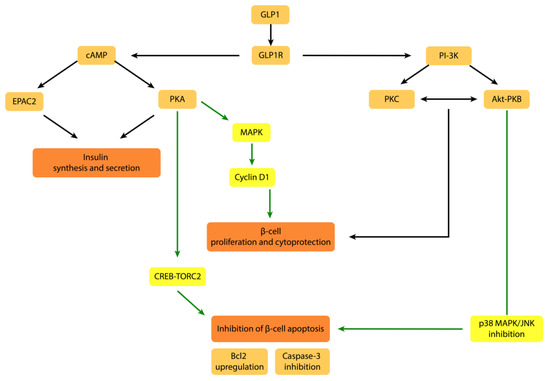 GLP-1R activation mediates β-cells cytoprotection and proliferation, improving insulin-dependent metabolism. GLP-1 favors β-cell proliferation and neogenesis via Phosphatidylinositol-4,5-bisphosphate 3-kinase (PI-3K) and cAMP/PKA/mitogen-activated protein kinase (MAPK)/cyclin D1 pathways. The PI-3K-mediated pathway involves the activation of the epidermal growth factor receptor (EGFR) and further stimulation of protein kinase C (PKC) ζ and/or Akt-protein kinase B (Akt-PKB) [11].