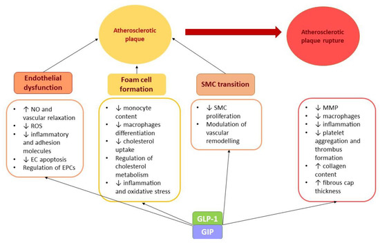 Nagashima and colleagues demonstrated that four-week administration of active forms of GLP-1, GLP-1(7–36) amide, or GIP, GIP(1–42), via binding to its specific receptors in Apo E -/- mice suppresses atherosclerotic lesion initiation and progression through the decrease in macrophages infiltration, foam cell formation and regulation of cholesterol metabolism in macrophages. Incretin treatment reduced the accumulation of cholesterol in macrophages and consecutive foam cell formation induced by oxidized LDL (ox-LDL) and suppressed the expression of adhesion molecules in endothelial cells and the proliferation of smooth muscle cells [75]. GLP-1(7–37) and the split products, GLP-1(9–37) produced by DPP-4 and GLP-1(28–37) produced by neutral endopeptidase-dependent cleavage proved additional anti-atherosclerotic properties involving plaque inflammation and stability. The plaque macrophage infiltration and matrix metalloproteinases-9 (MMP-9) expression were reduced by the GLP-1 products, whereas the plaque collagen content and fibrous cap thickness were increased. Both split products manifested similar properties with the GLP-1(7–37), although neither of them acted on GLP-1 classic receptors, so it was suggested that other supplementary mechanisms could be involved in the observed atheroprotective effects of GLP-1 [76].