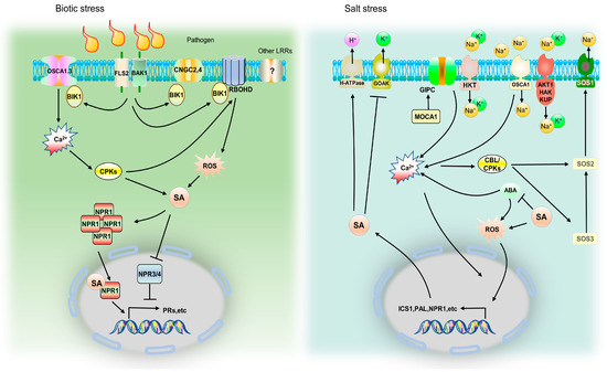 Several transporters contribute to Na+ absorption and efflux during saline stress (HKT, AKT1, GOAK, OSCA1, etc.). The membrane depolarizes when Na+ enters the cell. Since many K+ and Ca2+ channels are voltage-regulated, this shift in membrane voltage affects ion transport. H+-ATPase action can repolarize the membrane. Na+ binding to Glycosyl-Inositol-Phosphoryl-Ceramides (GIPCs) in the plasma membrane is required for the formation of saline stress-induced Ca2+ signals. Extracellular Na+ directly binds to negatively charged GIPCs (catalytic production by MOCA1) in the plasma membrane’s outer leaflet under saline stress. Na+-bound GIPCs may directly activate/regulate Ca2+ channels. The Ca2+ sensor protein CBL4 (SOS3) decodes the saline stress-induced Ca2+ signal by activating CIPK24 (SOS2), which then phosphorylates and activates SOS1 to pump excess Na+ out of the cell. The osmotic and saline stress-sensing components, OSCA1 and GIPCs, have a direct influence on the formation of the major osmotic/salt stress-induced Ca2+ signal; however, this is questionable in the case of AKT1 (K+). For AKT1, a regulatory function for Ca2+-dependent phosphorylation via CBL1/9-CIPK23 has been identified. Meanwhile, for OSCA channels, kinase-dependent regulation has been characterized; however, no evidence of a direct relationship with Ca2+ has yet been revealed. The plant hormone ABA can similarly influence SA synthesis by promoting the production of Ca2+ and ROS. Simultaneously, SA feedback influences ABA. SA increases the activity of H+-ATPases via NPR1 and decreases K+ leakage via the GORK channel. SA also modulates other salt response responses via unknown mechanisms (probably through NPR1).