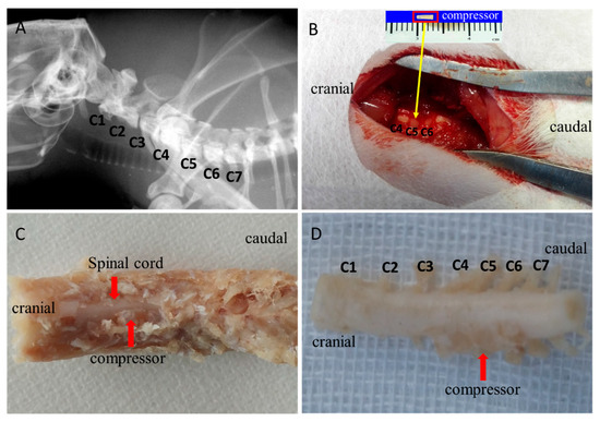 Establishment of experimental CSM model. (A) Preoperative spinal localization by X-ray fluoroscopy. (B) C4 lamina removing and polymer sheet implantation into C5 epidural space. (C) Ex vivo spinal specimen with compressor. (D) Expanded compressor identified at C5–C6 cord level.
