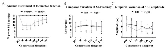 SFR was confirmed in modeling rats. (A) Obvious locomotor function recovery since 7th day showed by BBB scoring. (B,C) Shortening latency and increasing amplitude of SEP was identified from 7th day. “*” Compared with preoperative, “#” compared with 7th day (p < 0.05).