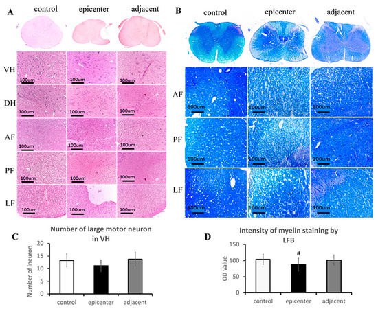 In a quantitative analysis, there is no significant reduction in the number of large motor neurons found in the ventral horn (VH) (p < 0.05) (Figure 3C). A significant reduction of blue staining intensity was found in the compressive epicenter compared to the control group (p < 0.05), but no significant difference in staining intensity (Figure 3D) was found between adjacent level and the control group (p > 0.05).