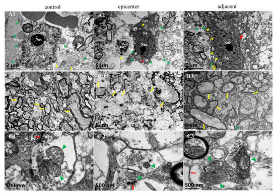 Ultrastructural findings by TEM further confirmed neuronal degeneration and axonal demyelination (Figure 4). In the control group, the Nissl body (Nb) was evenly distributed in the neuron nucleus and rich mitochondria were identified with distinguishable cristae (Figure 4(A1)). In the compressive epicenter, results showed high electronic density of the neuron nucleus and low density of the cytoplasm (Figure 4(A2)), as well as mitochondrial swelling and cristae disappearance (Figure 4(A2)) and thinner myelin and destruction of the neurofilament (Figure 4(B2)). Relative normal ultrastructure of neuron (Figure 4(A3)) and reorganization of axons and the myelin sheath (Figure 4(B3)) were seen in the adjacent level. Compared with the distinguished mitochondrial cristae of the synapse in the control group, loss of mitochondrial cristae and synaptic vesicle of synapses were observed in the compressive epicenter (Figure 4(C2)). In the adjacent level, a similar appearance of synapse was seen to that of the control group and the number of mitochondria and synaptic vesicles increased (Figure 4(C3)).