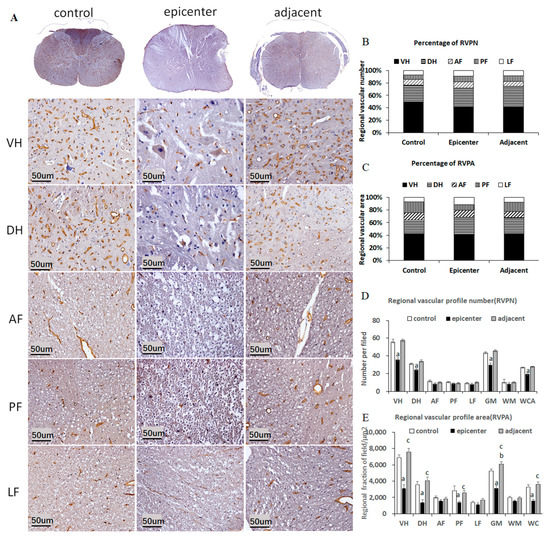EBA immunoreactivity and microvascular anatomical distribution. (A) EBA immunoreactivity in different anatomic regions and groups. RVPN (B)/RVPA (C) anatomic distribution. The largest proportion of blood vessels is located in GM, especially in VH. (D,E) Quantitative analysis of blood vessels in different anatomic regions. The RVPN/RVPA decreased significantly in the VH and DH of the compressive epicenter, whereas increased they in the adjacent level. Data are presented as mean values ± SE for standardized ×20 microscopic fields (0.0694 mm²); “a, b”, different from control group; “c”, adjacent level different from the compressive epicenter (p < 0.05, repeated measures ANOVA followed by Bonferroni tests). Note: “VH”, ventral horn; “DH”, dorsal horn; “AF”, anterior funiculus; “PF”, post funiculus; “LF”, lateral funiculus.
