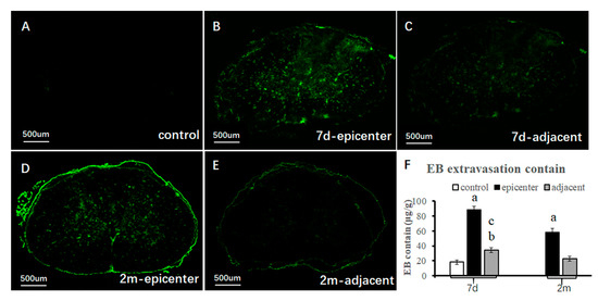 Disruption of BSCB integrity. (A) Negative EB fluorescence in control group. (B) EB fluorescence widely spread into the GM of the compressive epicenter at the 7th day. (C) Obvious decreased EB fluorescence in adjacent level at the 7th day. (D) Decreased EB fluorescence in the compressive epicenter at the 2nd month. (E) Significantly decreased EB fluorescence in adjacent level at 2nd month. (F) EB extravasation content increased significantly in the epicenter and adjacent level at the 7th day, while it decreased at the 2nd month. No significant difference was found between the adjacent level at 2nd month and the control group. “a,b”. compared with control group; “c”, compressive epicenter compared with adjacent level (p < 0.01).