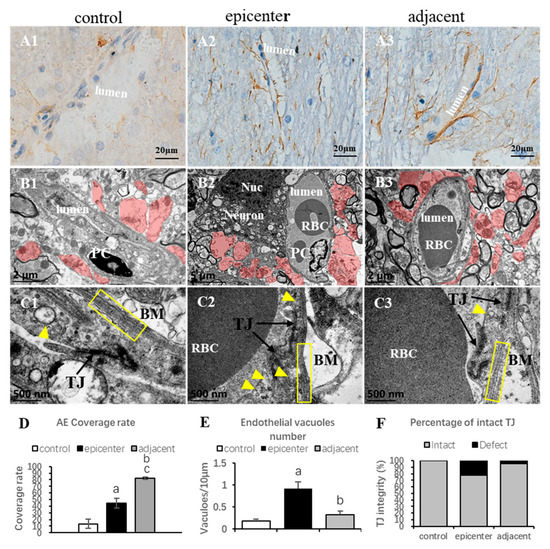 Microvascular compensation in the adjacent level. (A1, A2, A3) Perivascular astrocyte endfeet. (A1) Sparse astrocyte endfeet in the VH of the control group. (A2) Astrocyte endfeet detach from the endothelial cells of microvessels in the compressive epicenter. (A3) Proliferated astrocyte endfeet in the adjacent level. (B1–B3) Neurovascular ultrastructure. (B1,C1) Normal microvascular components including distinct endothelium, high electronic density TJ and PC) nucleus, clear lamina of BM and surrounded perivascular astrocytic endfeet (red shadow) in control group. Homogeneous electron density. (B2,C2) NVU degeneration in the compressive epicenter, including collapsed microvascular wall, disorganized BM and loss of TJ integrity, neuron degeneration and apoptosis, formation of phagolysosomes and autophagic vacuoles. (B3,C3) Restoration of microvascular microstructure. (D) Significant increase of astrocytic endfeet both in the compressive epicenter and adjacent level. (E) Significant decrease of vacuoles number in endothelial in adjacent level. (F) Restoration of TJ integrity in adjacent level. PC (pericyte), Nuc (nucleus), TJ (tight junction), BM (basement membrane), RBC (red blood cell); “a,b”. compared with control group; “c”, adjacent level compared with the compressive epicenter (p < 0.05).