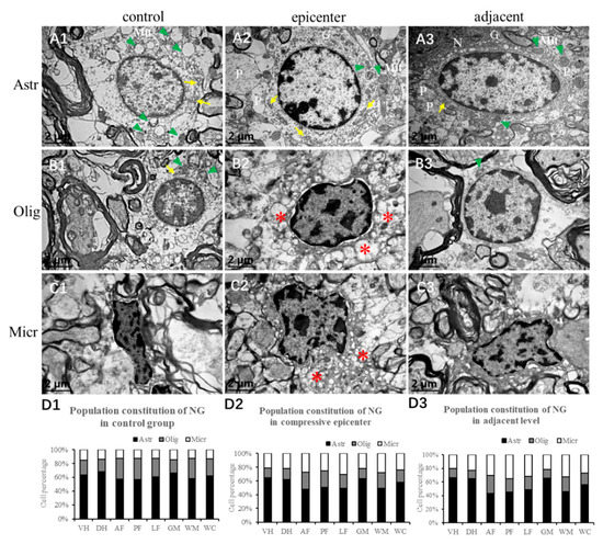 Morphology of neuroglial cells by TEM examination. (A1–A3) Astrocytes (Ast) exhibited even distribution and low-density karyoplasm with abundant cytoplasm and cytoplasmic organelles such as granular endoplasmic reticulum (yellow arrow), Golgi complexes (G), ribosomes and mitochondria (green arrowhead), as well Nemours processes (P); (B1–B3) Oligodendrocytes (Olig) were smaller than the astrocytes with dense clumped chromatin aggregated eccentrically around the rim of the karyolemma. Numerous phagocytosed vacuolations (*) were identified; (C1–C3) Microglial cells (Micr) appeared to have irregular morphology and with clumped chromatin. Numerous phagocytosed vacuolations (*) were seen in the compressive epicenter. (D1–D3) Population constitution of neuroglial cells (NG) in different anatomic regions.