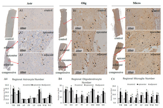 Neuroglial cells activation after chronic compression. Anti-GFAP, Anti-OLIG2 and Anti-AIF1/Iba1 antibody labeled astrocytes (A1–A3), oligodendrocytes (B1–B3) and microglial cells (C1–C3) in the control group, compressive epicenter and adjacent level, respectively. A large number of reactive astrocytes (A2, black arrowhead), oligodendrocytes (B2) and activated microglial cells (C2) were seen in the compressive epicenter. (A3) Milder increased activation of astrocytes (A3), oligodendrocytes (B3) and activated microglial cells (C3) were also seen in the adjacent level. Regional quantitative analysis of results demonstrated an increased number of astrocytes (A4), oligodendrocytes (B4) and microglial cells (C4) after compression, especially in the GM of the compressive epicenter, as well as the adjacent level. Regional number per field are presented as mean values ± SE for standardized ×20 microscopic fields (μm²). Note: a,b. compressive epicenter/adjacent level compared to control group; c, compressive epicenter compared with adjacent level (p < 0.01).