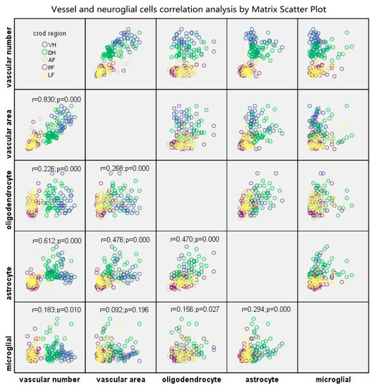 Interrelation among microvascular number/area and neuroglial cells including oligodendrocytes, astrocytes and microglial cells. Note: “VH”, ventral horn; “DH”, dorsal horn; “AF”, anterior funiculus; “PF”, post funiculus; “LF”, lateral funiculus.