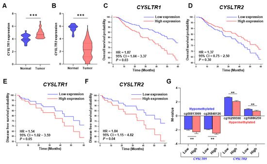 Violin plot of the relative expression and Kaplan–Meier survival plot of the CYSLTR1 and CYSLTR2 genes in the TCGA-COADREAD cohort. Relative expression of CYSLTR1 (A) and CYSLTR2 (B) between normal and tumor samples. Five-year Kaplan–Meier overall survival plots for CYSLTR1 (C) and CYSLTR2 (D). Five-year Kaplan–Meier disease-free survival plots for CYSLTR1 (E) and CYSLTR2 (F). (G) Correlation of M-values for CpG probes with CYSLTR1 (cg00813999, cg26848126) and CYSLTR2 (cg16299590, cg16886259) gene expression in tumor samples. ** p < 0.01; *** p < 0.001.