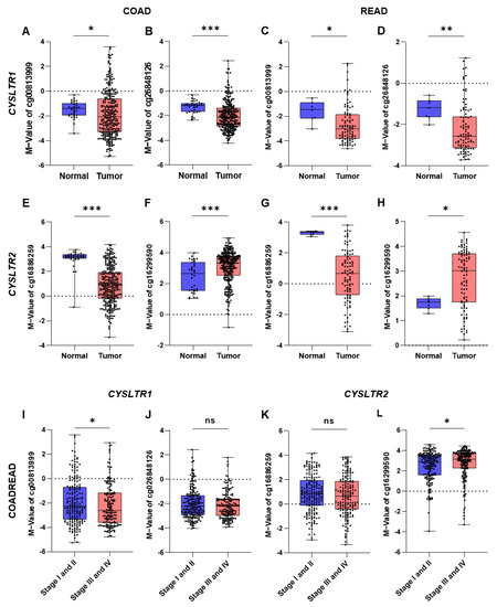There was a significant decrease in the negative M values for the two CpG probes for CYSLTR1 in colon tumors (cg00813999 and cd26848126, Figure 2A,B) and rectal tumors (cg16886259 and cg16299590, Figure 2C,D) compared with matched normal samples. However, a significant decrease in positive M-values for the CpG probe cg16886259 (Figure 2E,G) and an increase in positive M-values for the CpG probe cg16299590 (Figure 2F,H) for CYSLTR2 were observed in the colon and rectal tumors compared with matched normal samples. On the other hand, the M-values for cg00813999 and cd16299590 probes were significantly decreased and increased in the late TNM stages (stage III and IV) compared with early TNM stages (stage I and II), respectively (Figure 2I,L), but the other two probes (cg026848126 and cg16886259) did not achieve a significant level (Figure 2J,K).