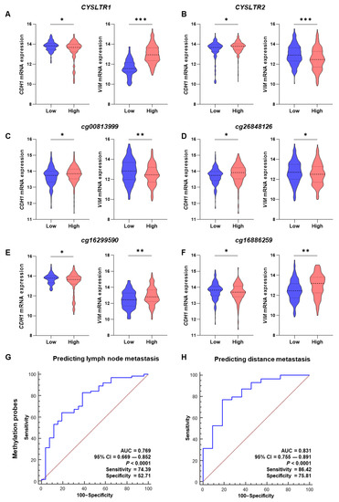 Correlation of EMT marker (CDH1 and VIM) expression and CYSLTR1 and CYSLTR2 gene expression and their CpG probes in the TCGA-COADREAD cohort. (A) Correlation between CDH1 and VIM gene expression with high and low CYSLTR1 gene expression. (B) Correlation between CDH1 and VIM gene expression with high and low CYSLTR2 gene expression. (C–F) Correlation between CDH1 and VIM gene expression with high and low M values for the CpG probes of CYSLTR1 (cg00813999 and cg26848126) and CYSLTR2 (cg16299590 and cg16886259) genes. ROC–AUC curve for the prediction of lymph node metastasis (G) and distant metastasis (H) using the M values for CpG probes of CYSLTR1 and CYSLTR2 genes. * p < 0.05; ** p < 0.01; *** p < 0.001.