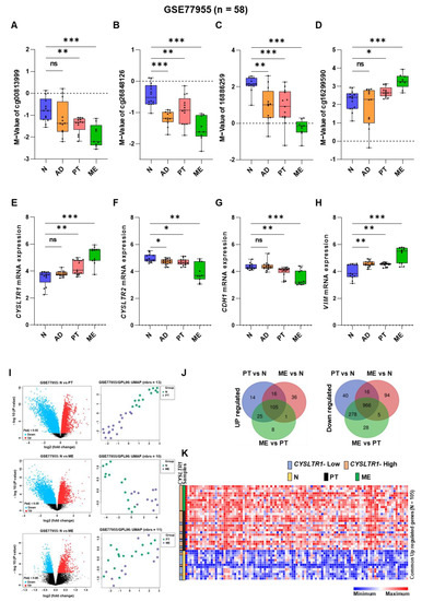 M-value distribution for the CpG probes of the CYSLTR1 and CYSLTR2 genes and their expression in matched normal (N), adenoma (AD), primary tumor (PT) and distant metastasis (ME) samples in the GSE77955 CRC cohort. (A–D) M-value distribution for the CpG probes in the N, AD, PT and ME samples. Relative expression of CYSLTR1 (E) and CYSLTR2 (F) genes between the N, AD, PT and ME samples. Relative expression of CDH1 (G) and VIM (H) genes between the N, AD, PT and ME samples. (I) Volcano plots and UMAP plots for the differentially expressed genes (DEGs) between PT vs. N, ME vs. N and ME vs. PT samples. (J) Venn diagram for the up-and downregulated genes from the DEGs between PT vs. N, ME vs. N and ME vs. PT samples. (K) Heatmap for the commonly upregulated gene expression in N, PT and ME samples. * p < 0.05; ** p < 0.01; *** p < 0.001.