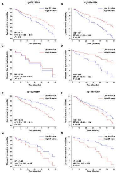 We achieved a significant hazard ratio (HR) in the overall survival analysis for the CpG probe cg26848126 (HR = 1.51, 95% CI = 1.03–3.44, p = 0.03), whereas the other CpG probe (cg00813999) for CYSLTR1 did not achieve a significant p value (Figure 5A,B). The low M-value significantly separated the poor prognosis group for five years of OS prediction. On the other hand, the HR was not significant for five years of DFS for either CpG probe, although the low M-value of cg26848126 could separate the poor prognosis group with a p = 0.06 (Figure 5C,D). Interestingly, we observed the opposite trend for the CpG probe of CYSLTR2. A high M-value for both probes (cg16299590 and cg16886259) was positively correlated with poor prognosis in five years of overall survival; although cg16299590 achieved a significant HR (HR = 2.14, 95% CI = 1.11–4.12, p = 0.03, Figure 5E), the other probe did not achieve a significant p value (HR = 0.77, 95% CI = 0.44–1.14, p = 0.09, Figure 5F). In the case of the five-year DFS prediction, a high M-value of the CpG probes of the CYSLTR2 gene was positively correlated with poor prognosis (Figure 5G,H), although cg16886259 was only significant for DFS assessment (HR = 2.88, 95% CI = 1.07–5.76, p = 0.03, Figure 5H).